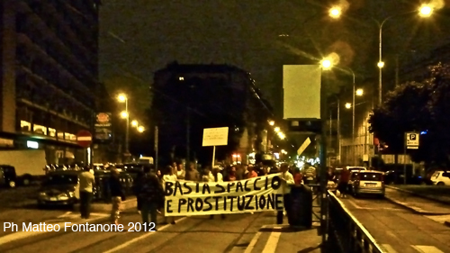 Si muovono alle dieci meno venti, tra i sorrisi sarcastici di alcuni uomini delle forze dell’ordine schierate, un’ispettrice ridacchia al telefono, mentre un suo collega lamenta il fatto di dover passare la sera qui e non alla recita della figlia. Il promotore in mimetica regge insieme al compagno lo striscione “basta spaccio e prostituzione”, dietro al quale procede ordinata la marcia, composta da circa cinquanta persone. Usano fischietti e sonagli, megafoni, invitano la gente che li guarda perplessa dai balconi a scendere e a manifestare con loro. I manifestanti smentiranno le accuse, ma una ragazza affacciata dal balcone sostiene che non siano questi i problemi reali e bolla l’iniziativa come venata di razzismo. All’altezza dell’incrocio tra Corso Massimo e Corso Dante, una delle partecipanti schernisce una prostituta di passaggio. Il corteo si sposta lentamente, giunge al civico 14 di Via Giotto, dai cui balconi i manifestanti hanno già ricevuto generose secchiate d’acqua. Le voci dai megafoni si intensificano quando si arriva in Via Ormea ad un isolato da Corso Bramante, i cui palazzi è risaputo ospitino diverse mestieranti. Poco più avanti, seduta sui gradini di un pub, proviamo a parlare con una ragazza slava che ci allontana malamente pur riconoscendo ai manifestanti i loro diritti.