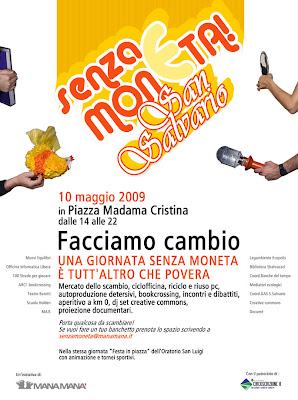 Domenica 10 maggio 2009 dalle 14 alle 22 va in scena in p.zza Madama Cristina “Senza Moneta”, che altro non è se non un vero e proprio mercato del baratto, dove potrete scambiare ogni sorta di oggetti con i “banchettari” presenti. Ma l’evento non si riduce solo a questo, nel corso della giornata avrete la possibilità di far aggiustare la vostra gloriosa e/o malandata bici presso la ciclofficina così come comprare detersivi autoprodotti, assistere a dibattiti e a proiezioni di documentari, senza dimenticare aperitivi e dj set.