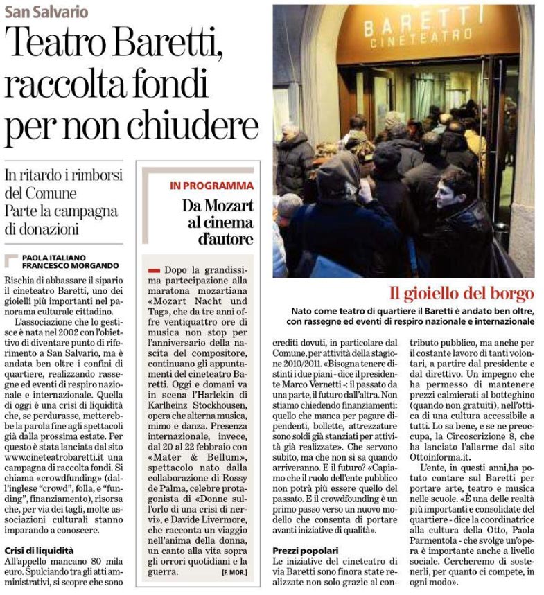 Il Cineteatro Baretti è in difficoltà. A causa di mancati pagamenti del Comune di Torino la continuazione delle numerosissime iniziative del Cineteatro Baretti è in forse. Si dice anche che questa potrebbe essere l’ultima stagione di questo formidabile presidio culturale sito nel cuore di San Salvario, incastrato fra locali alla moda e piccoli negozi in via di sparizione.