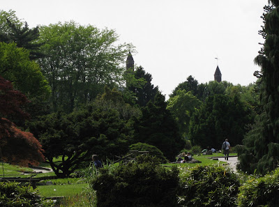 Scorcio del Giardino Roccioso nel Parco del Valentino.Sullo sfondo i due “minareti” del Palazzo degli Istituti Anatomici.