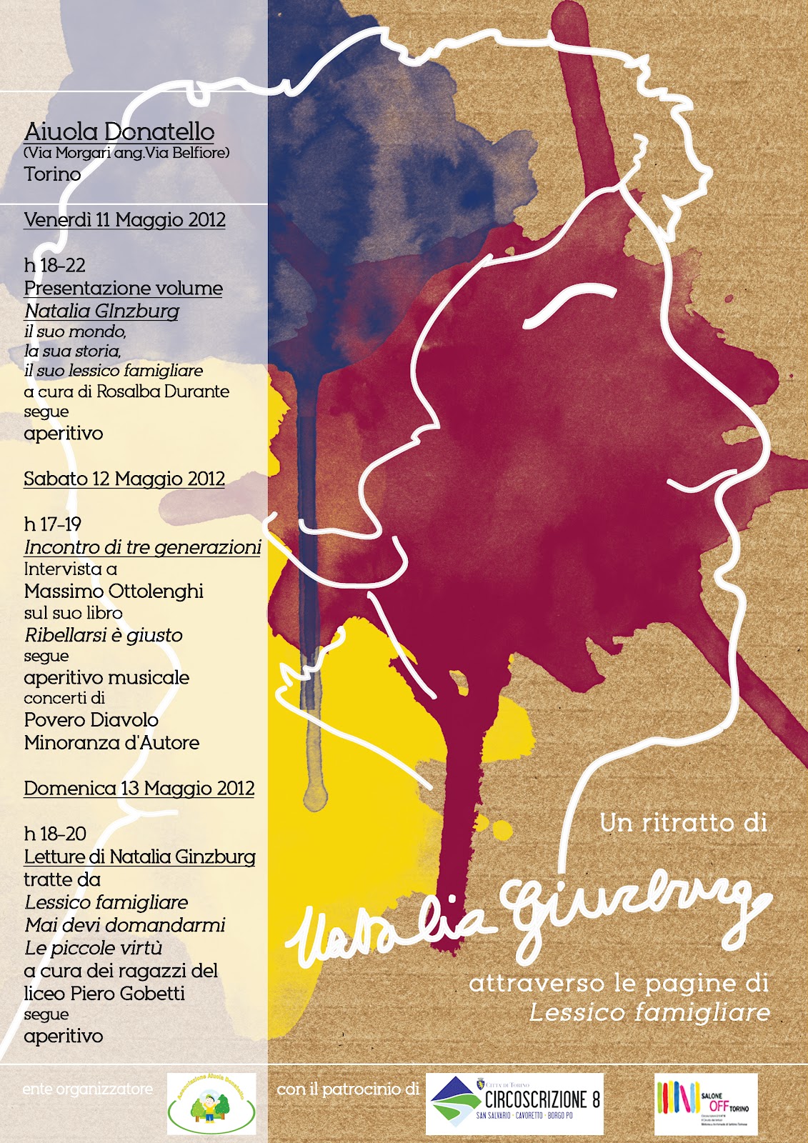 In occasione del Salone del Libro OFF si svolgerà una rassegna dedicata a Natalia Ginzburg e il suo mondo all’Aiuola Donatello, fra via Morgari e via Belfiore. Nella piazzetta verrà realizzata una mostra e verranno presentati due libri. Seguiranno letture, concerti e aperitivi.