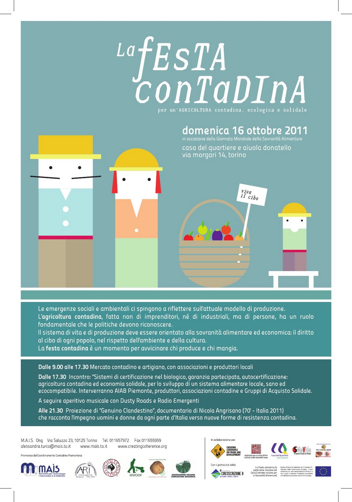 In occasione della Giornata Mondiale della Sovranità alimentare, domenica 16 ottobre 2011 il CCP – Coordinamento Contadino Piemontese (MAIS, ARI, AIAB, WWOOF, Civiltà Contadina e Consorzio della Quarantina), in collaborazione con l’Agenzia per lo Sviluppo Locale di San Salvario, organizza una Festa Contadina presso la Casa del Quartiere di San Salvario e l’Aiuola Donatello (via Morgari 14 – Torino).