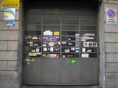 Già! Tutti quegli sticker lo rendono unico! E soprattutto ci sono sempre automobili vecchie parcheggiate fuori ed una gigantesca carrozzeria di un’ automobile anni’ 30 all’ interno…prima o poi devo chiedere che ci stà a fare!