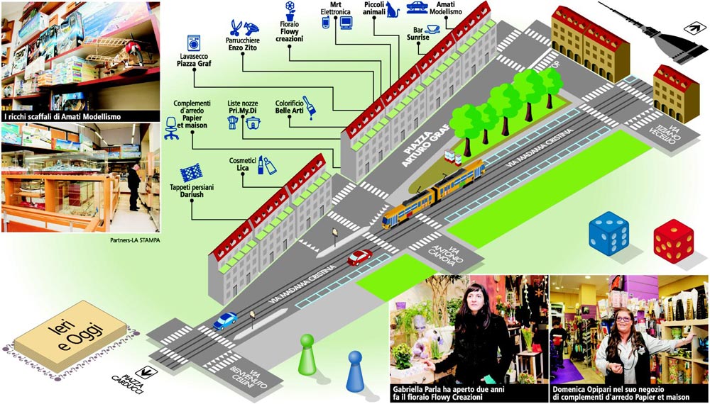 Inutile dire che la clientela di questo affascinante tempio per i bricoleur viene da tutta la città, attratta da pezzi unici, soprattutto navi. «Sono la nostra specialità, vendiamo modellini che non è facile reperire altrove». L’età media degli acquirenti è compresa tra i 35 e i 50 anni, «gente di buona cultura e di discreta disponibilità economica, perché in genere per i nostri prodotti può spendere chi ha qualche risorsa in esubero dal budget familiare». Per il titolare il fatto di essere qui, piuttosto che altrove, è indifferente. «L’importante è operare in una zona decentrata e facilmente raggiungibile, requisiti a cui piazza Graf risponde in pieno. Poi negli ultimi anni è migliorata, specie per la pulizia e l’ordine pubblico».