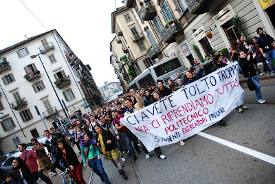 Oggi pomeriggio dopo una partecipatissima assemblea svoltasi nel cortile centrale del Politecnico in corso Duca degli Abruzzi un gruppo di circa un migliaio di studenti, dopo aver temporaneamente bloccato il traffico per qualche decina di minuti, si è mosso in corteo verso il castello del Valentino, sede della facoltà di Architettura, la più colpita dai disagi relativi alla protesta dei ricercatori.