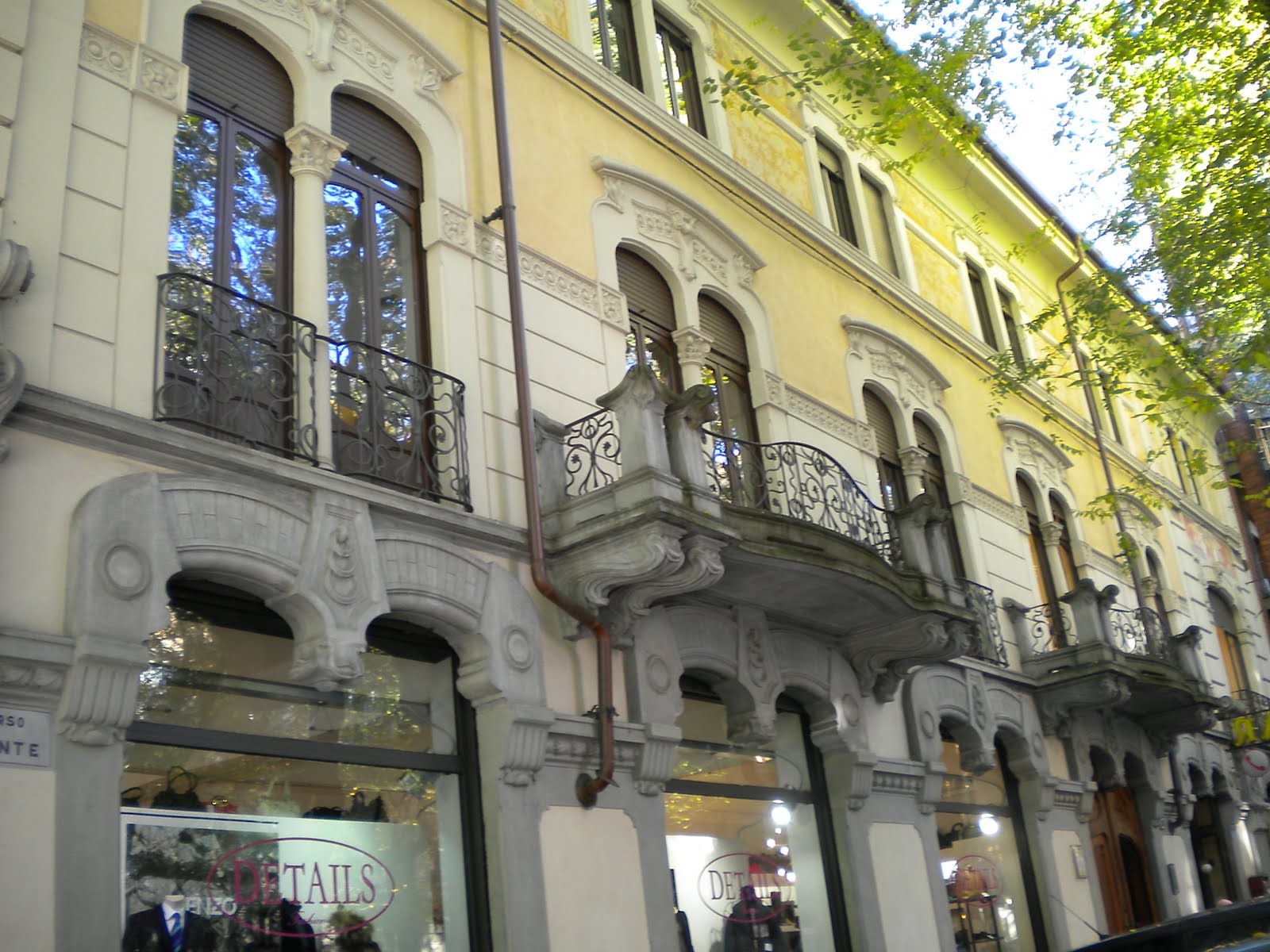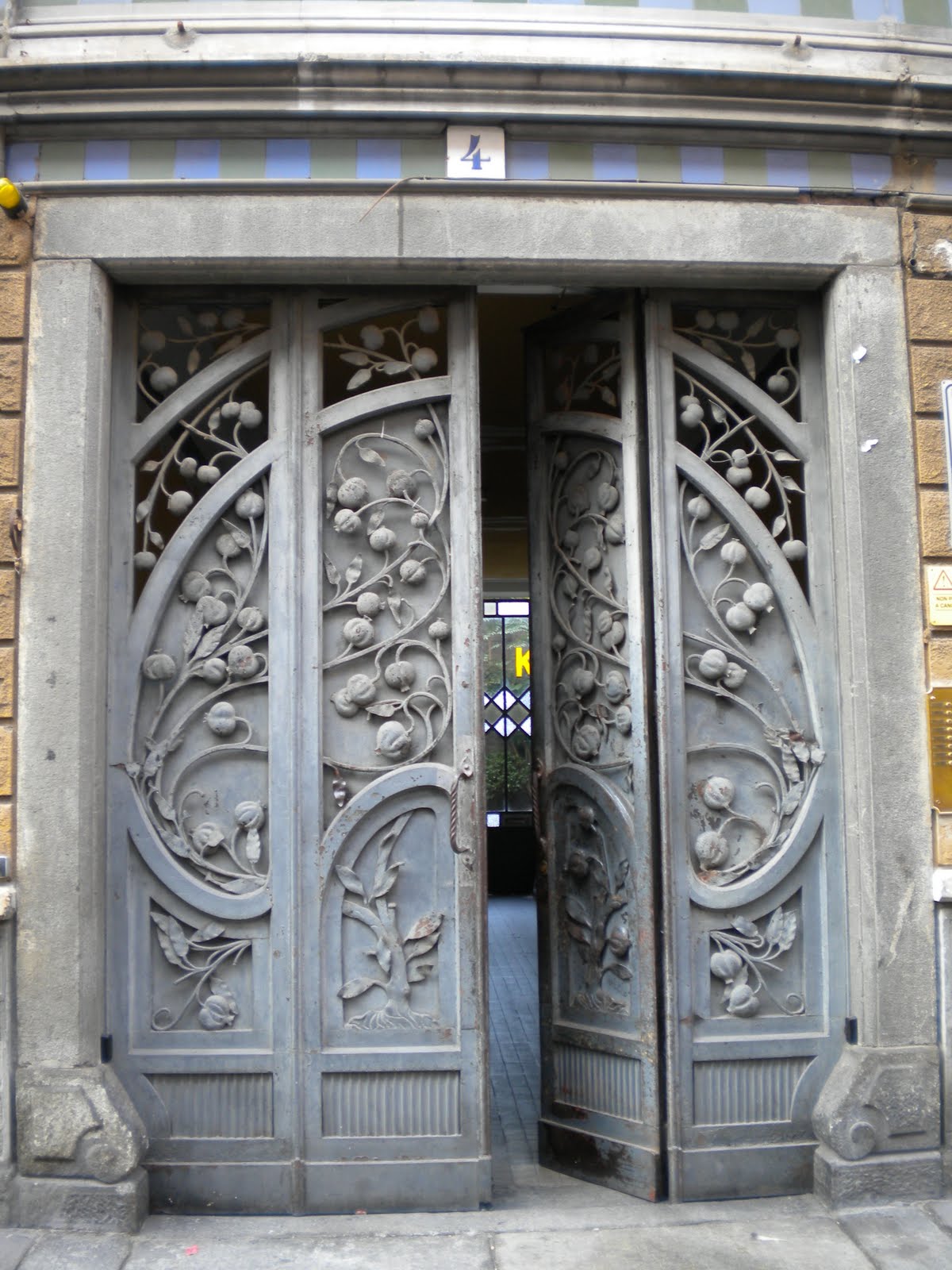 Un bellissimo portale in ferro battuto illustra due alberi di melograno, ricchi di foglioline e frutti, in una cornice a coda di pavone. Il palazzo, ricordando alcune case spagnole, utilizza linguaggi liberty nelle maioliche e nell’ uso del ferro per sorreggere i balconi. Anche qui c’è lo zampino di Pietro Fenoglio, che progettò l’ edificio nel 1907.