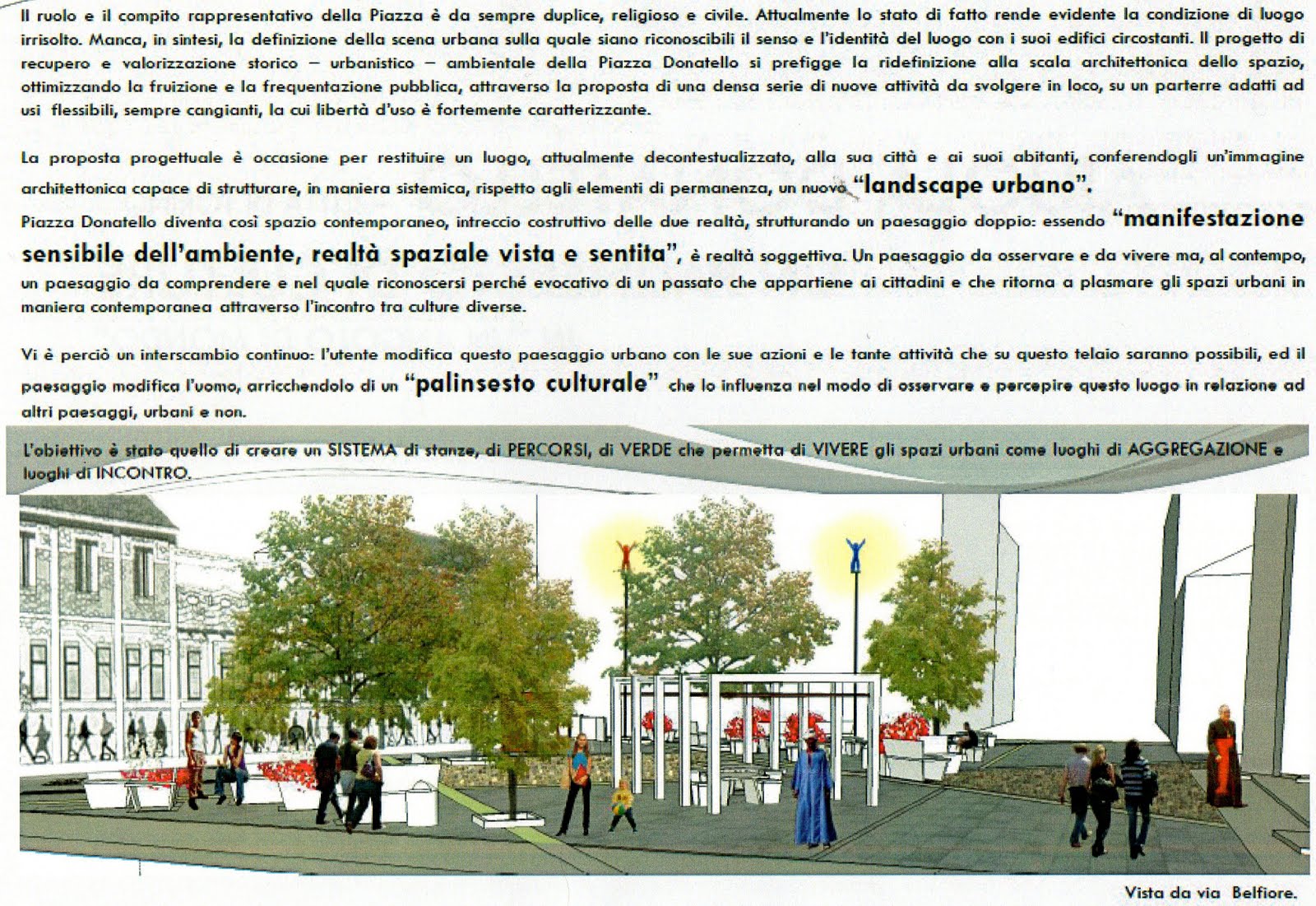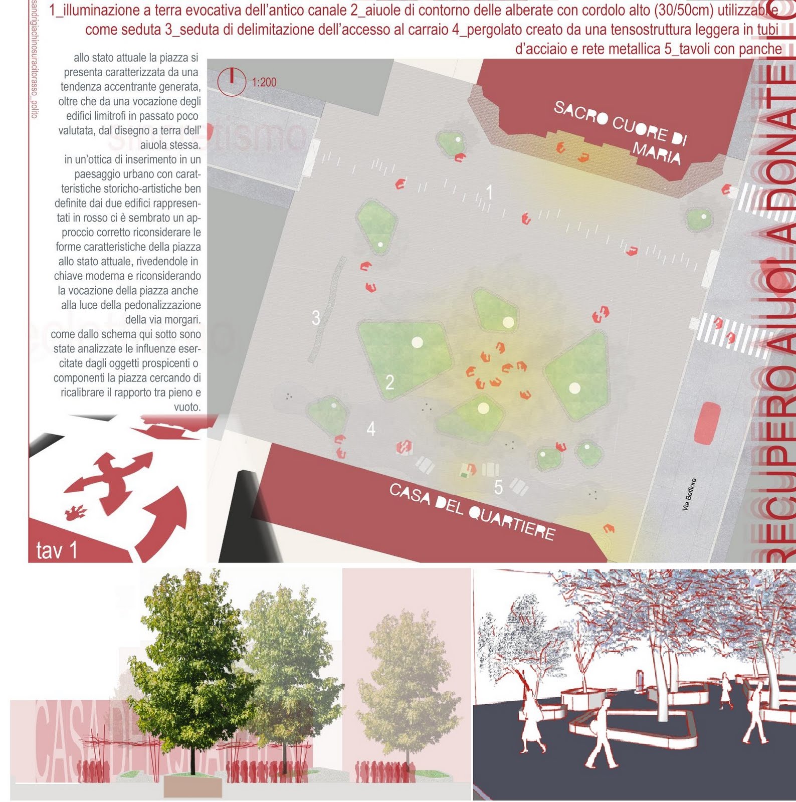 I progetti sono accomunati dalla volontà di pedonalizzare lo spazio antistante la chiesa e dalla necessità di spezzare l’asimmetria che caratterizza l’aiuola.