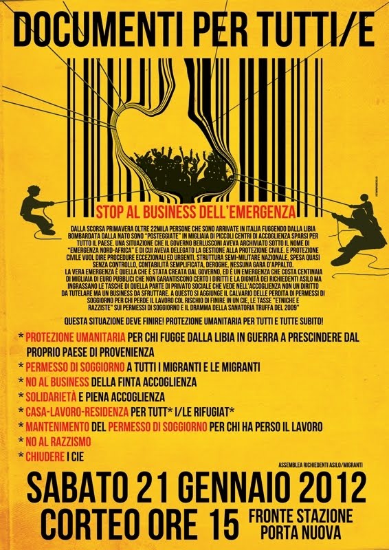 La vera emergenza è quella che è stata creata dal governo, ed è un’emergenza che costa centinaia di migliaia di euro pubblici che non garantiscono certo i diritti e la dignità dei richiedenti asilo ma ingrassano le tasche di quella parte di privato sociale che vede nell’accoglienza non un diritto da tutelare ma un business da sfruttare. A questo si aggiunge il calvario della perdita del permesso di soggiorno per chiedere il lavoro col rischio di finire in un CIE. Le tasse “etniche e razziste” sui permessi di soggiorno e il dramma della sanatoria truffa del 2009