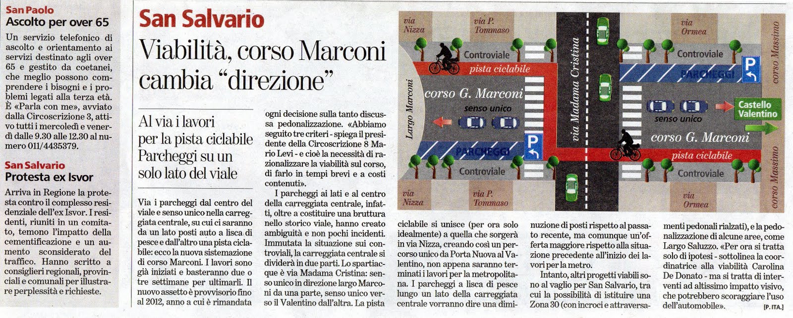 Allucinante … se la pista ciclabile, dal lato di Via Nizza, non si collega ad un altro tratto (quando?) mi spiegano a cosa serve??? E intanto la gente parcheggia sulla pista ciclabile perché di posti, con l’apertura di nuovi locali della movida, non ce ne sono a sufficienza… Poi per attraversare via Madama in bici ti devi fare 2 semafori…