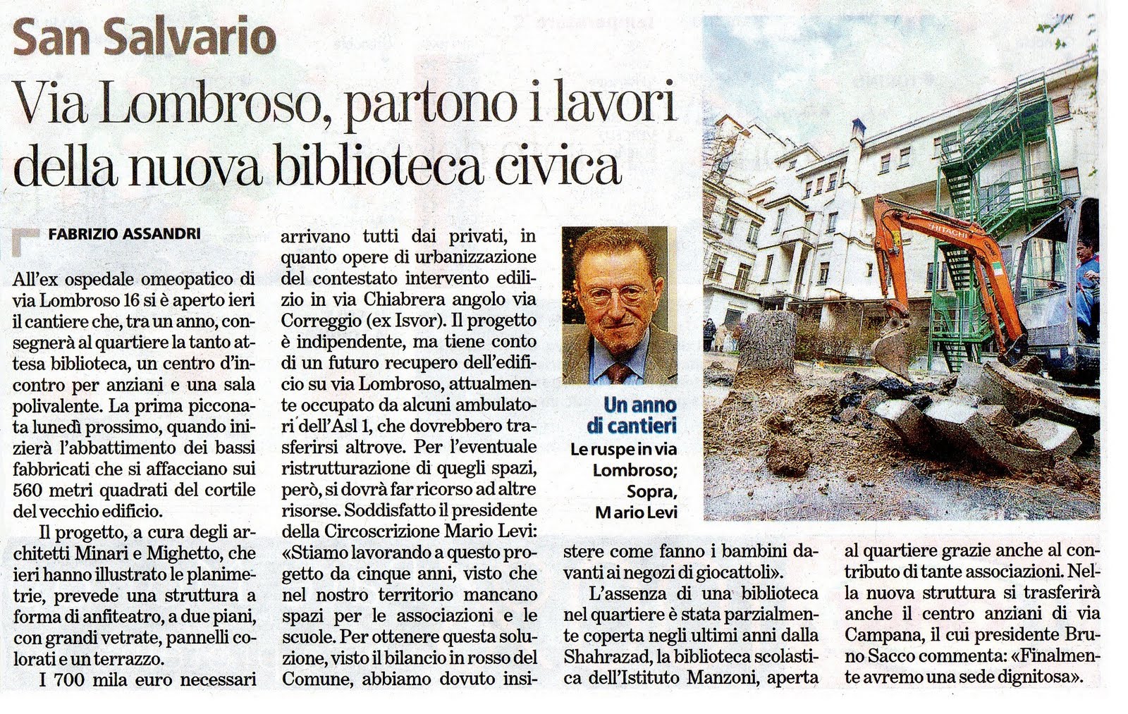 Iniziati oggi (simbolicamente) durante il sopralluogo della circoscrizione i lavori per la realizzazione del tanto atteso complesso culturale di via Lombroso 16, che comprenderà una biblioteca a scaffale aperto, una sala polivalente e un centro di aggregazione. La nuova struttura sorgerà nel cortile dell’ex ospedale omeopatico. I lavori dovrebbero terminare a gennaio 2012.