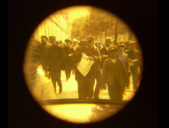 All’esterno delle officine poche auto, strade deserte, silenzio intuibile e non per l’evidente mancanza del sonoro, una carrozzella, un passeggero e un cavallo, un tram aperto, un’edicola con pochi giornali. Tranquillità e misura. Identica atmosfera si respira all’interno dell’officina, ancorché i locali siano popolati di operai e tecnici al lavoro attorno ai pezzi, alle macchine, agli strumenti di lavoro, ai cassoni ingombri di materiali. Qualche ragazzo, nessuna donna, l’ambiente illuminato dalla luce artificiale diffusa da una selva di eleganti globi opacizzati che scendono dal soffitto nobilitandolo della loro presenza calda e cordiale. Gli operai indossano casacche di tessuto grezzo, molti hanno i baffi, non sembrano disturbati dal fatto di essere ripresi, lavorano, tirano focosamente di lima, uno in particolare desta attenzione per via di un fazzoletto legato al mento, segno di un probabile ma sopportato mal di denti. E siamo alla conclusione introdotta dal cartello: Mezzogiorno! annuncio che apre la sequenza dell’uscita per la pausa pranzo, pagina per altro antologica di per sé che segna l’inizio delle due ore di interruzione dal lavoro degli operai e dei funzionari, molti dei quali tornavano alle loro abitazioni. Tutti portano un copricapo nonostante la stagione mite. Così a giudicare dall’abbigliamento leggero. Berretti, lobbie, cappelli a larga tesa, panama, ma nessun basco.Qualcuno si scopre in segno di saluto rivolto a chi dietro la cinepresa sta riprendendo quella circostanza felice.