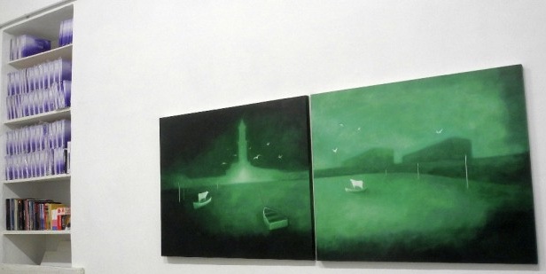 “Una metafora, un sogno – non esita a spiegare Morales – Le mucche servono a rappresentare un paradosso: sono animali stanziali, mi ricordano un po’ l’Argentina. In senso anche un po’ onirico, viaggiano trainate da questi uccelli, golondrinas, le chiamiamo noi. Sono le rondini, migranti quindi”. Il viaggio la memoria e poi il sogno, come dire, nella monocromaticità dei toni del verde e del blu.