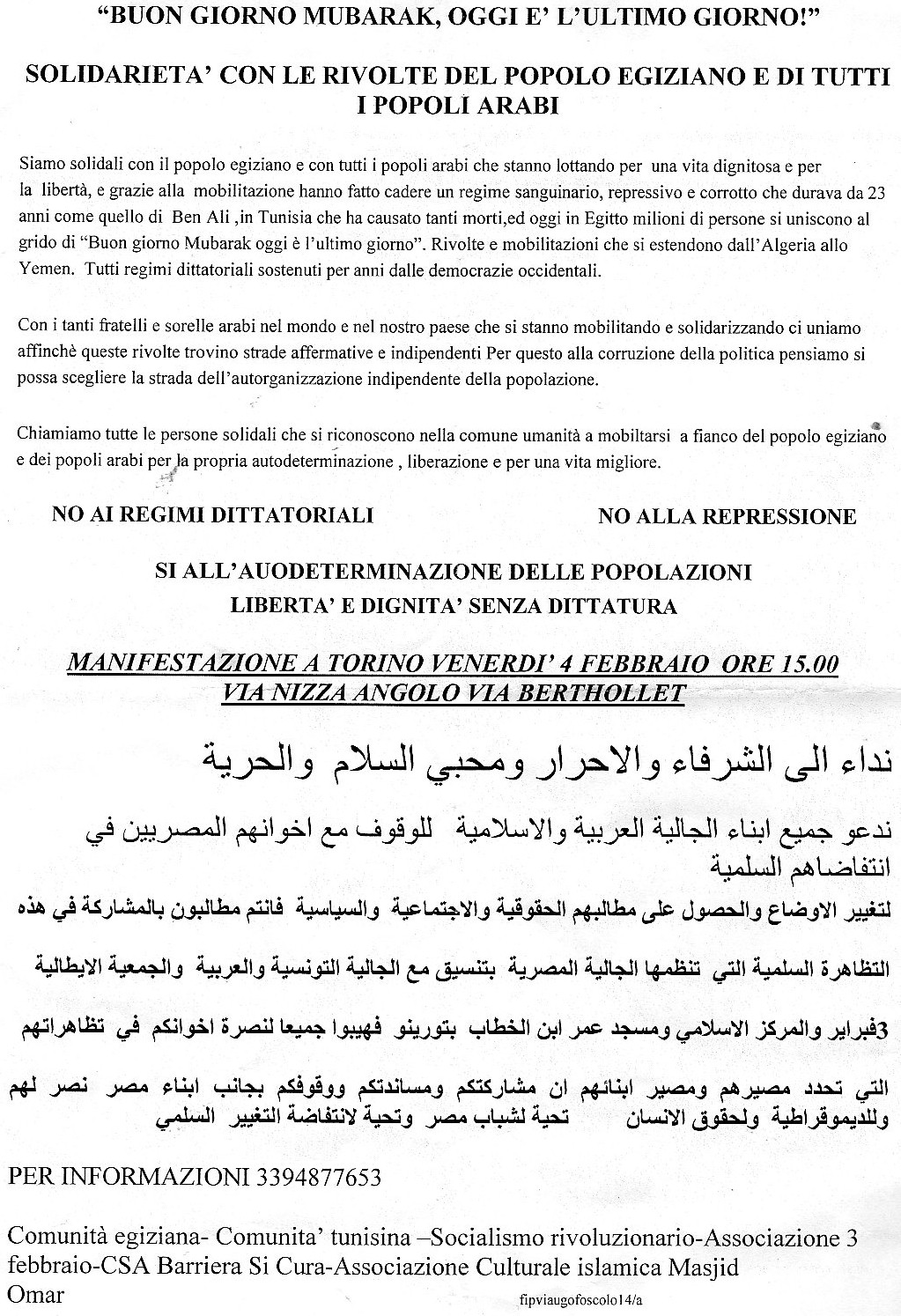 Solidarietà con le rivolte del popolo egiziano e di tutti i popoli arabi