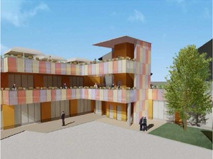 Disposti ad anfiteatro, secondo un orientamento obliquo rispetto a quello del lotto per moltiplicare gli assi percettivi e rendere meno incombenti i volumi di nuova edificazione, i nuovi corpi si sviluppano a partire da un nucleo centrale (rivestito all’esterno di pannelli colorati), da cui si dipartono due maniche. La manica su due piani ospiterà la biblioteca e un centro conferenze, quella a un piano il centro di incontro.
