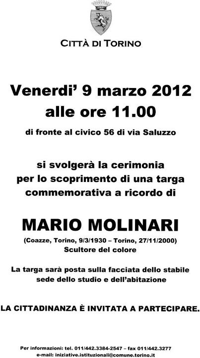 In occasione dell’anniversario della nascita del grande artista, venerdì 9 marzo alle ore 11 verrà posta una targa commemorativa sull’edificio che è stato, ed è ancora, lo studio-abitazione di Mario Molinari, in via Saluzzo 56.